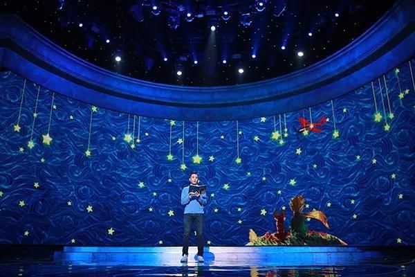 为了更契合朗读嘉宾的人生经历和读本内容,设计团队利用纱幕投影打造全息影像,营造逼真的视觉效果。针对刘烨朗读的《小王子》的故事情节,设计团队将纱幕与LED屏幕前后相衬,将舞台打造成空间感和层次感十足的蔚蓝星空。纱幕上投影着斑斓的星河,流星时而划过,闪耀着光芒,与舞台上的大屏幕连接成一片梦幻幽静的世界。